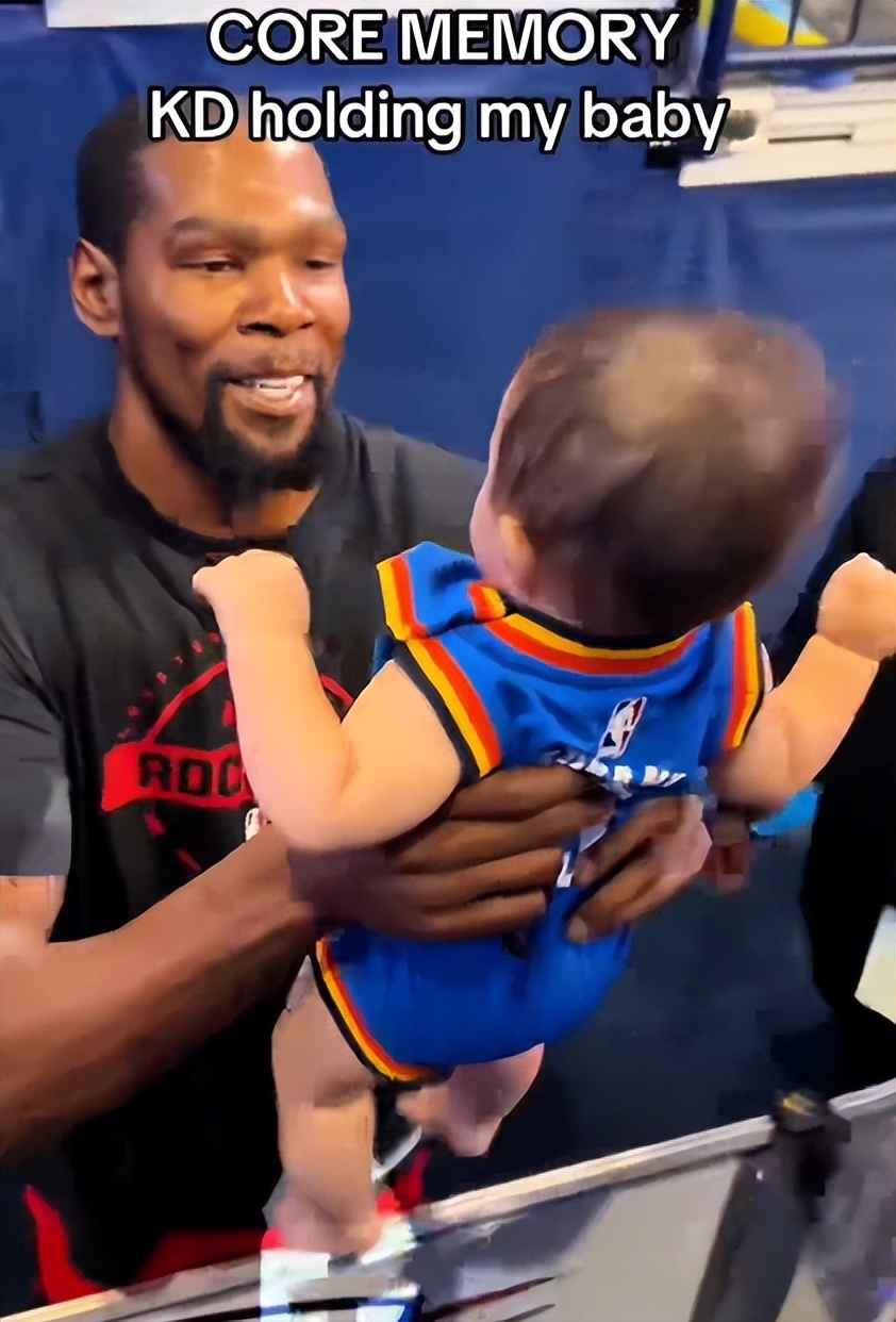 一位球迷在社交媒体上发布了视频,并配文写道:“珍贵的回忆,KD拥抱了我的孩子”。